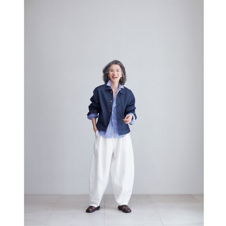 「素敵世代のカーブパンツ選びは、カジュアル過ぎないものが基準。それを叶えてくれるのが、白のリネン素材です。デニムジャケットのネイビーとラベンダーのシャツも映えて、清潔感のあるスタイルに仕上がります」