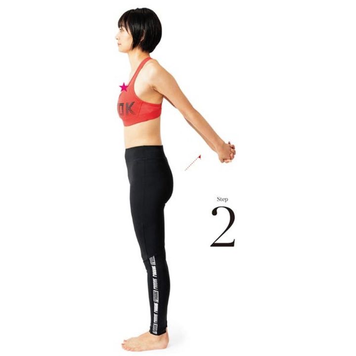 足を軽く開いて立ち、体の後ろで両手を組みます。