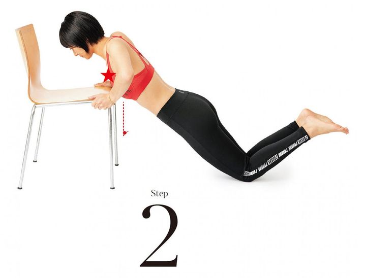 そのまま腕立て伏せをします。胸をイスに近づけるイメージで行いましょう。