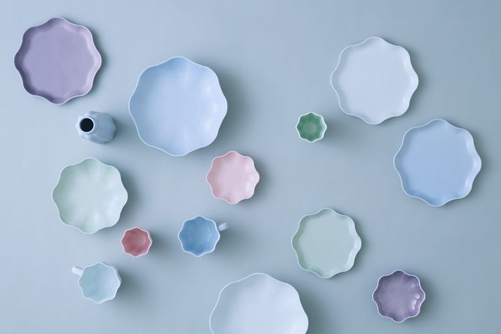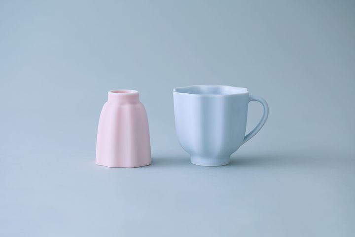ブランドを象徴する“ポタリー スカート”を彷彿(ほうふつ)とさせる立体的で柔らかなフォルムの磁器は、350年の歴史を誇る伊万里鍋島焼の窯元「畑萬陶苑(はたまんとうえん)」との協業により誕生。ラインナップは、ティーカップやマグカップ、プレート、ボウル、フラワーベースなど計8型。いずれも絵付けを排したミニマルなデザインで、天草陶石の素地を活かしたマットな質感が、現代的な食卓に新たな装いを提案する。