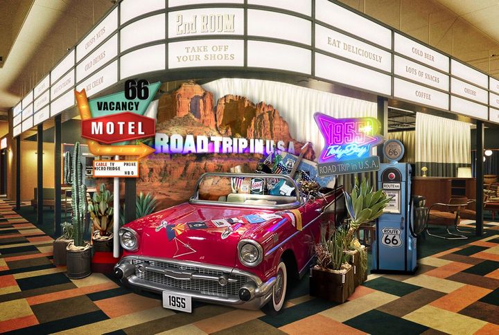 Route 66は、ダイナーやモーテルなど往年のロードサイドカルチャーが栄えた象徴的な道路です。その100周年にちなみ、「1955 東京ベイ」のパブリックスペース「2nd Room」では、当時のドライブシーンをモチーフにしたフォトスポットが登場!