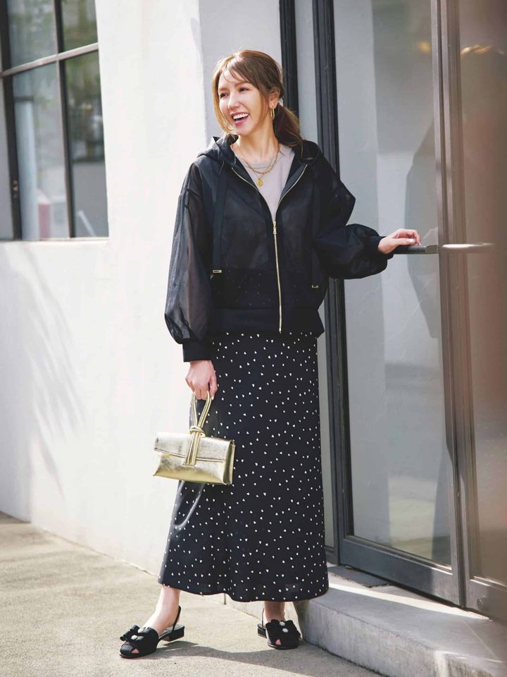 甘さたっぷりなハートのドット柄は、ALL黒の格上げに最適。ワントーンコーデにメリハリをつけ、パッと華やかなビジュアルを生み出します。このシーズンにピッタリなシアー素材のパーカーも抜け感作りにおすすめです。