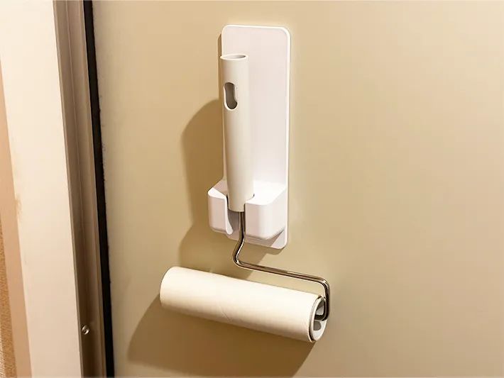 『シャワーホルダー』を玄関ドアに貼りつけ、粘着クリーナーを収納すれば、外出前に手軽にかけることができます。