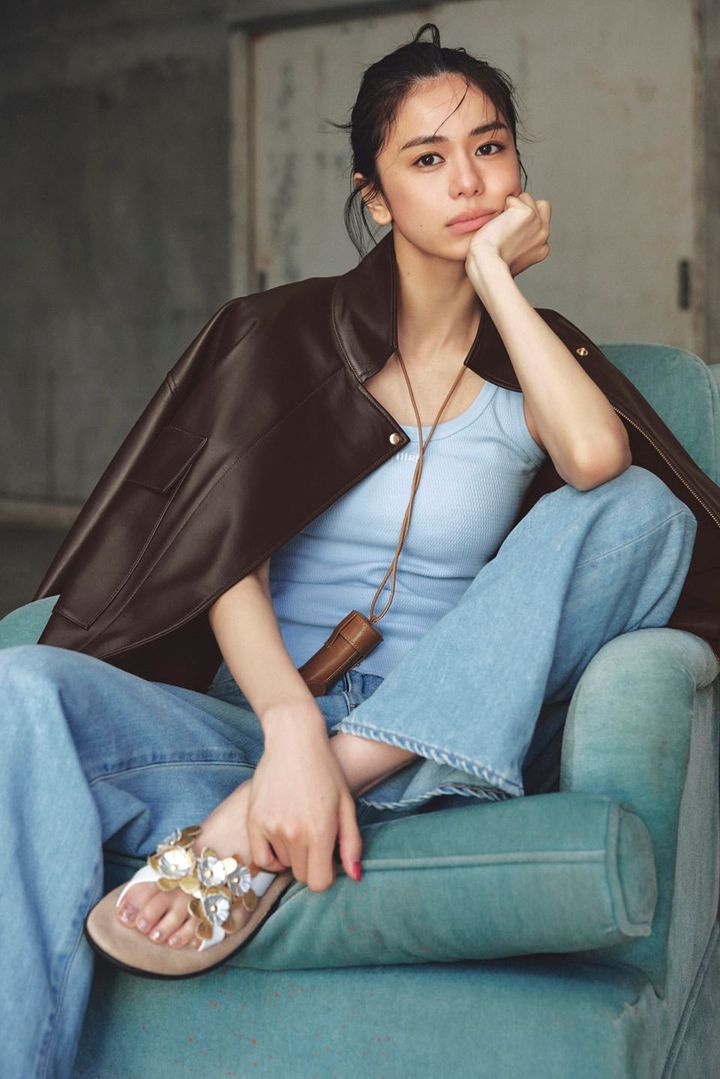 レザーブルゾン¥319,000(ドゥロワー/ドゥロワー 青山店)、タンクトップ¥8,800(サードマガジン×フェイス/サードマガジン)、デニムパンツ¥27,500(ジャパン ブルー ジーンズ/S&T)、サンダル¥29,700(アイランドスリッパ/オデット エ オディール 新宿店)、リップケースチャーム¥18,700(パフト/アダム エ ロペ)