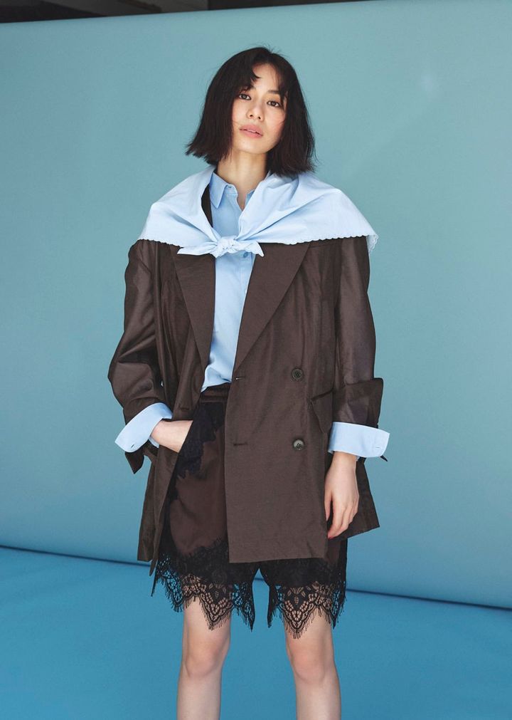 今季マストバイのサックスブルーのシャツに合わせたのはブラックレースが大人なブラウンのショーパン。トラッドな着こなしにプラスしたセンシュアルなエッセンスがなんとも新鮮!  スカラップレースの三角スカーフをサラリと巻いて大人の遊び心もON。ジャケットもやっぱりブラウンをチョイスして、ハンサムなムードもプラスして。