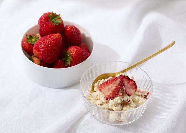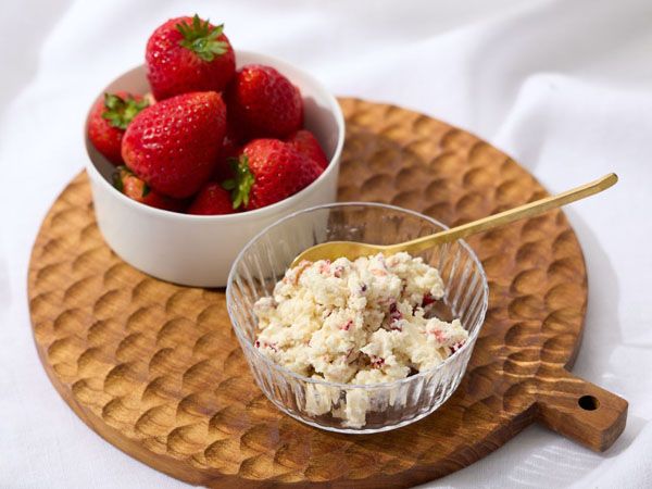 チーズには上品な甘みのいちごの果肉をたっぷりと混ぜ込み、酒粕の芳醇な香りと苺のやさしい甘みが調和した、滑らかな口どけを楽しめます。