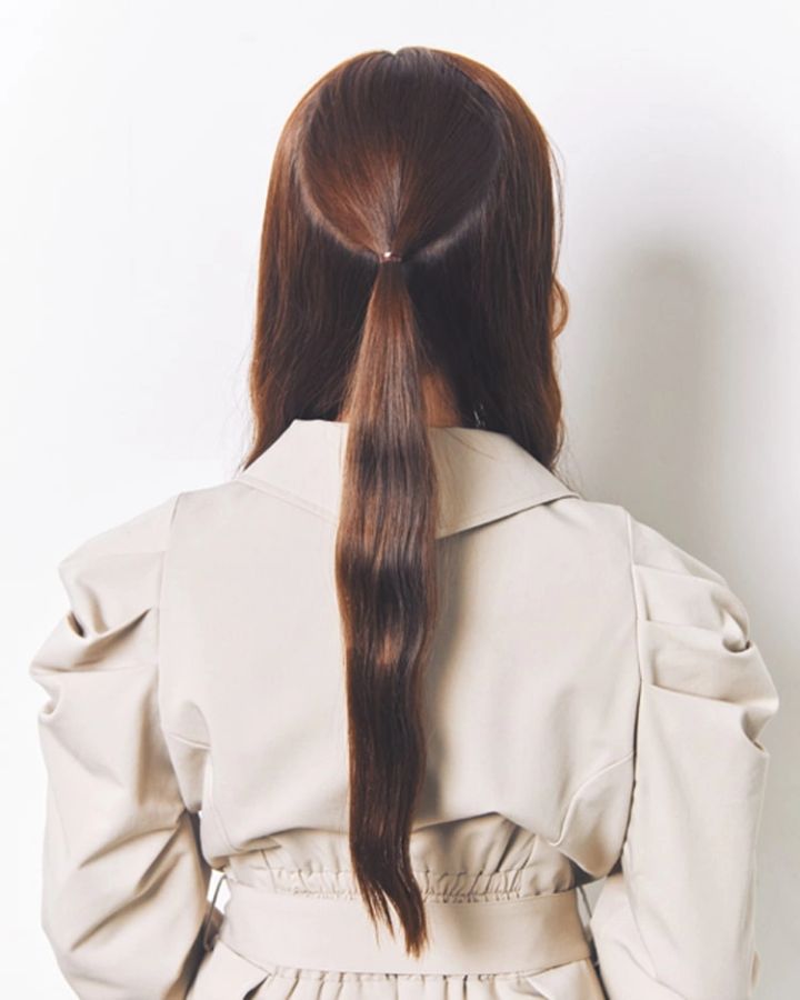 両サイドの耳上の髪を残した状態で、ハーフアップにする。このとき、ハチから後頭部の中心に向かってU字を描くように髪をとりわける。毛束は結び目を寝かせるように細ゴムで結んでおく。