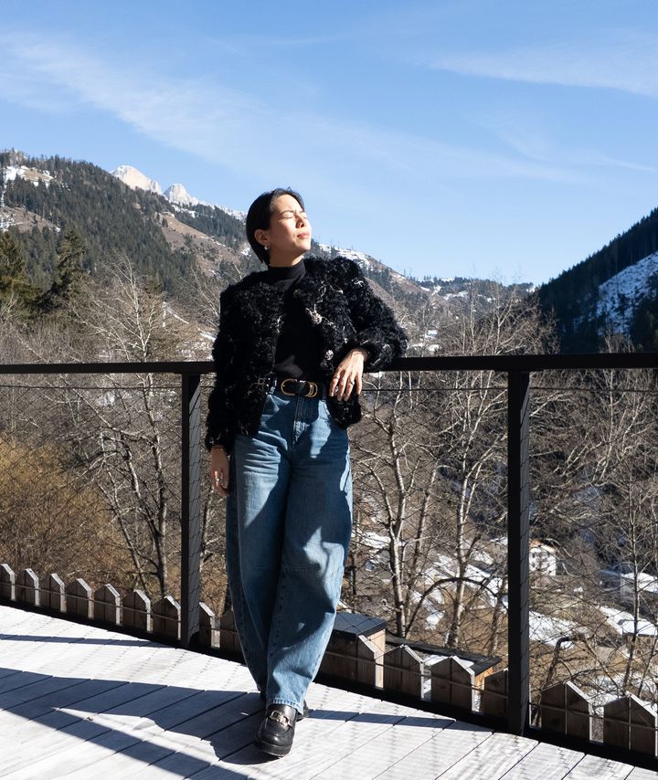 山の日差しは強いけど、まだまだ寒いドロミテ山脈。電車移動も楽なバレルジーンズをCHANELのジャケットでドレスアップ Hanako