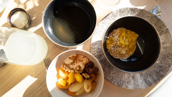 感動したのがお食事! ヨーロッパで旅行をすると胃が疲れるメニューが多くなりがちだけど(笑)、このホテルではアーユルヴェーダの考えに基づいた、胃腸に負担をかけない優しいメニューばかり。朝食は、消化に良いバスマティ米のポリッジに、フルーツのスパイスコンポート、そして豆乳のヨーグルト。