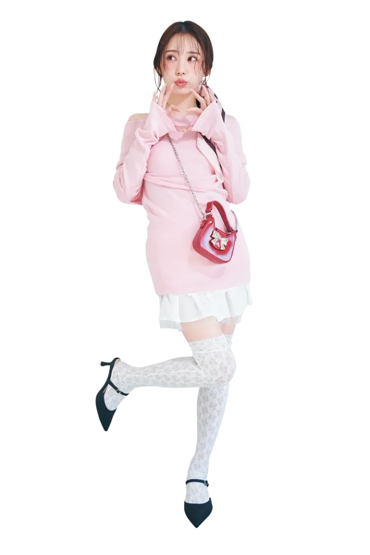 赤リボンバッグ(11×12×3.5cm)1,499円/GRL オフショルニット 6,290円/ZARA(ザラ)ミニスカート 12,650円/NOT YOUR ROSE(HANA KOREA)ドット柄スカーフ 3,289円/ROPÉ PICNIC PASSAGE(ジュン)レースソックス 2,420円/靴下屋(Tabio)ミュール(リボンつき)9,900円/RANDA