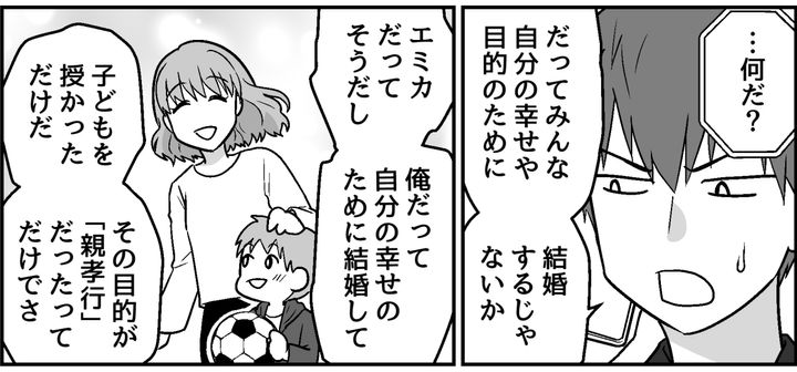 俺はひたすら「自分を幸せにしたい」と考えていたが、エミカは「自分も相手も生まれた子どもたちのことも幸せにしたい」と思っていた。そんな簡単なことにも気づかなかった。