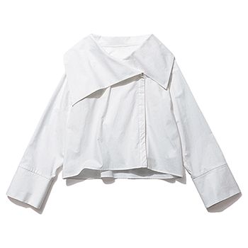 白ビッグカラーシャツ/HER. まっ白な色みと、アシンメトリーなデザインがモードを加速。