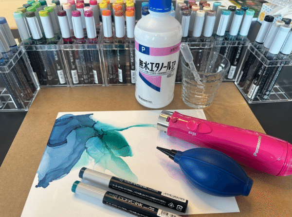 アルコールインクアートは、アルコールインクと無水エタノールを紙に垂らし、風を送ってインクを広げながら描くアート技法です。筆は使わず、風の強さや角度やインクの量によって表情が大きく変わっていきます。