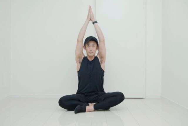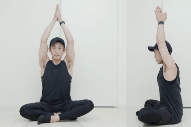 床にあぐらで座り、骨盤を立てて背筋を自然に伸ばします。頭頂が上に引き上がるような意識で、体の軸をまっすぐに。両腕を上げて手のひらを合わせ、ひじは耳の横に寄せてスタートポジションをつくります。