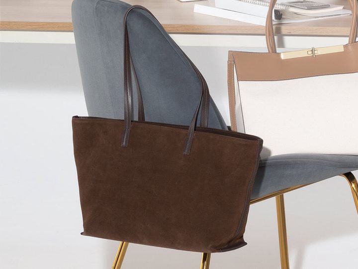 通勤バッグの王道、A4が入る横長トート。リッチなムードの〝茶系〟が狙い目です。合わせる服の色を選ばず、使い回し力抜群!
