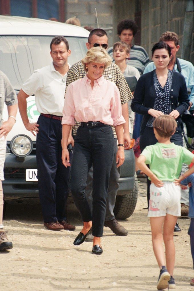 対人地雷禁止キャンペーンでボスニアを訪問した元妃は、黒デニムにピンクのシャツをタックインしたスタイルで登場。くるぶし丈のデニムから足首を少し見せることで、フェミニンな印象を与えています。