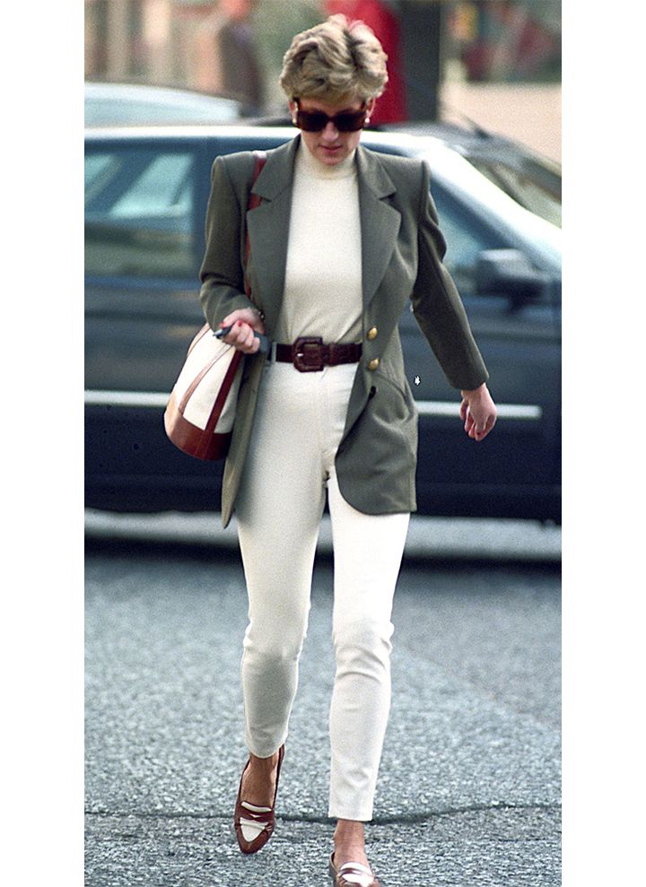 この日は白シャツにブルーデニムという、爽やかでヘルシーなスタイルを披露。ベルトとシューズはニュートラルなベージュで揃えることで、ダイアナ元妃の持つ優しげな雰囲気を引き立てました。