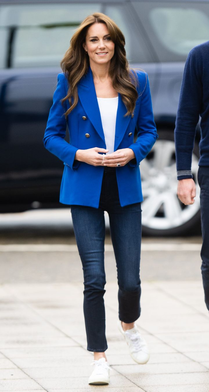 2023年10月にビシャム・アビー・ナショナル・スポーツセンターを訪問したときは、金ボタンが付いたザラのロイヤルブルーのジャケットと白Tシャツをコーディネート。青と白のツートーンでまとめ、凛とした印象に仕上げました。