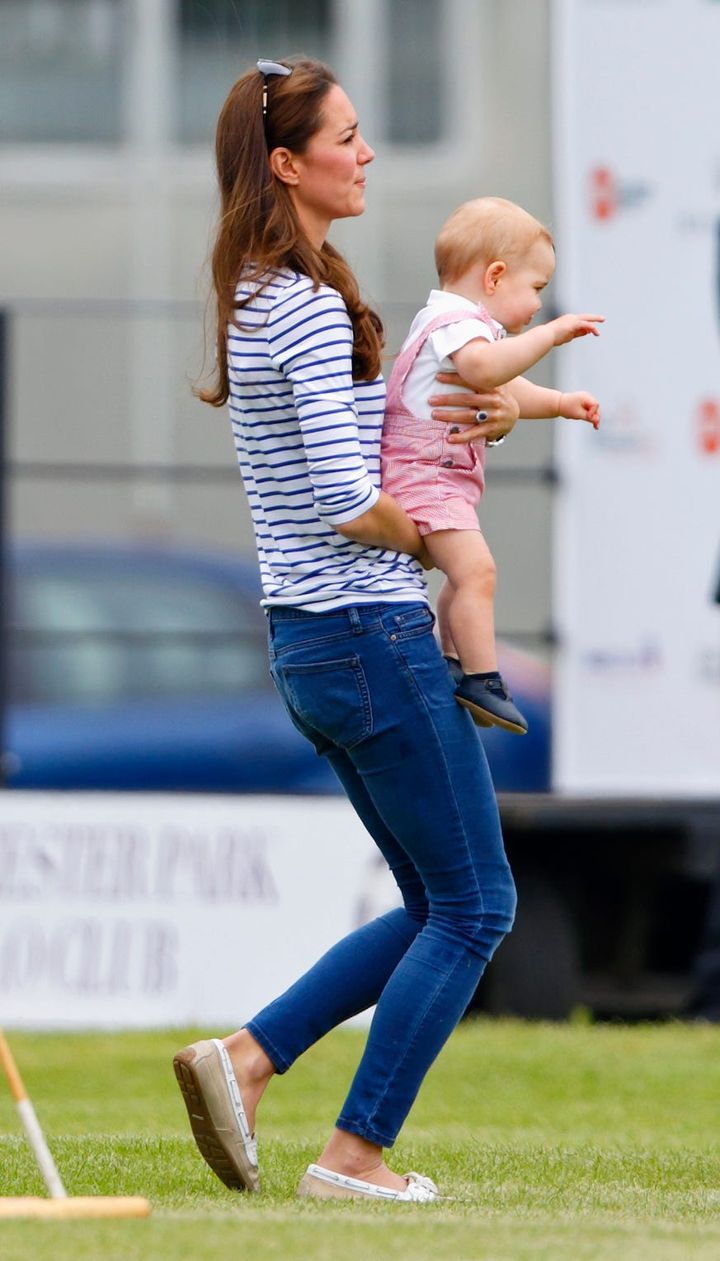 まだ幼いジョージ王子とともに、ポロの試合に出場する夫の応援に駆けつけた2014年6月。クラシックなボーダーのカットソーにブルーのスキニーデニムを合わせた軽やかなルックで姿を見せました。