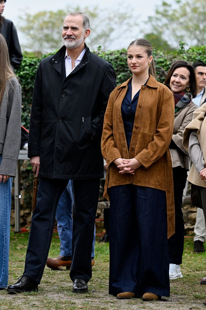 国王一家で参加した2025年10月の公務には、スペインのブランド、ラムソス(Ramsos)のデニムジャンプスーツをセレクト。ブラウンスエードのジャケットとブーツで、19歳(当時)とは思えない落ち着いたスタイリングに仕上げました。