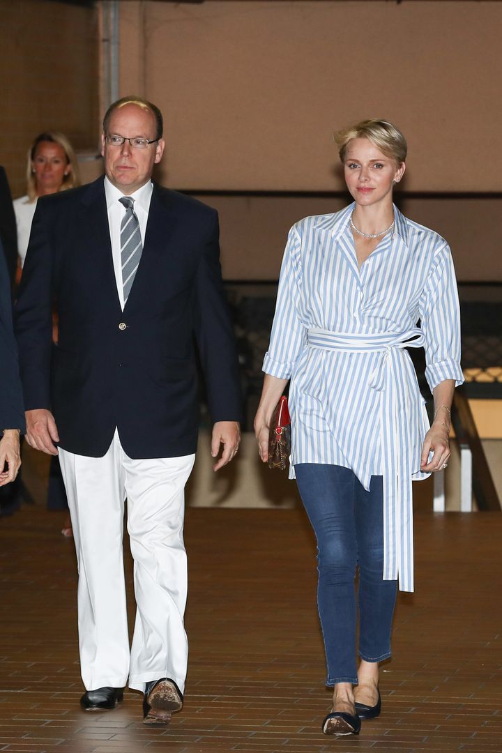 ハンサムでモードなファッションがお好きなシャルレーヌ公妃は、デニムコーデもシンプル派。この日は濃紺デニムにパリッとした白シャツを合わせていました。