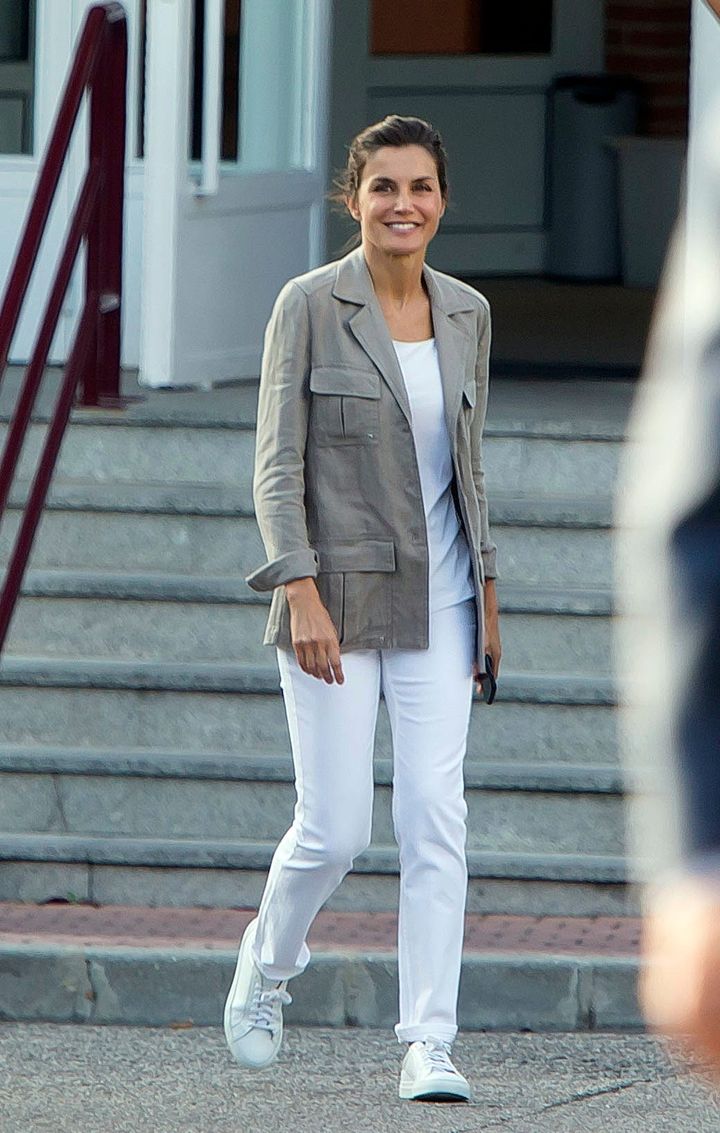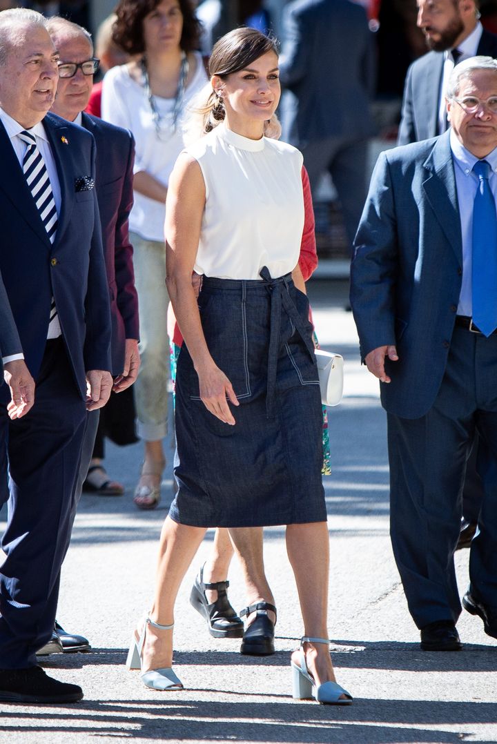 この日は濃紺のスカートをチョイスしたレティシア王妃。白のノースリーブトップスと水色のヒールを合わせて、涼やかなデニムルックを完成させました。ヘアは優美なシニョンにまとめることで、より軽快なムードにシフト。
