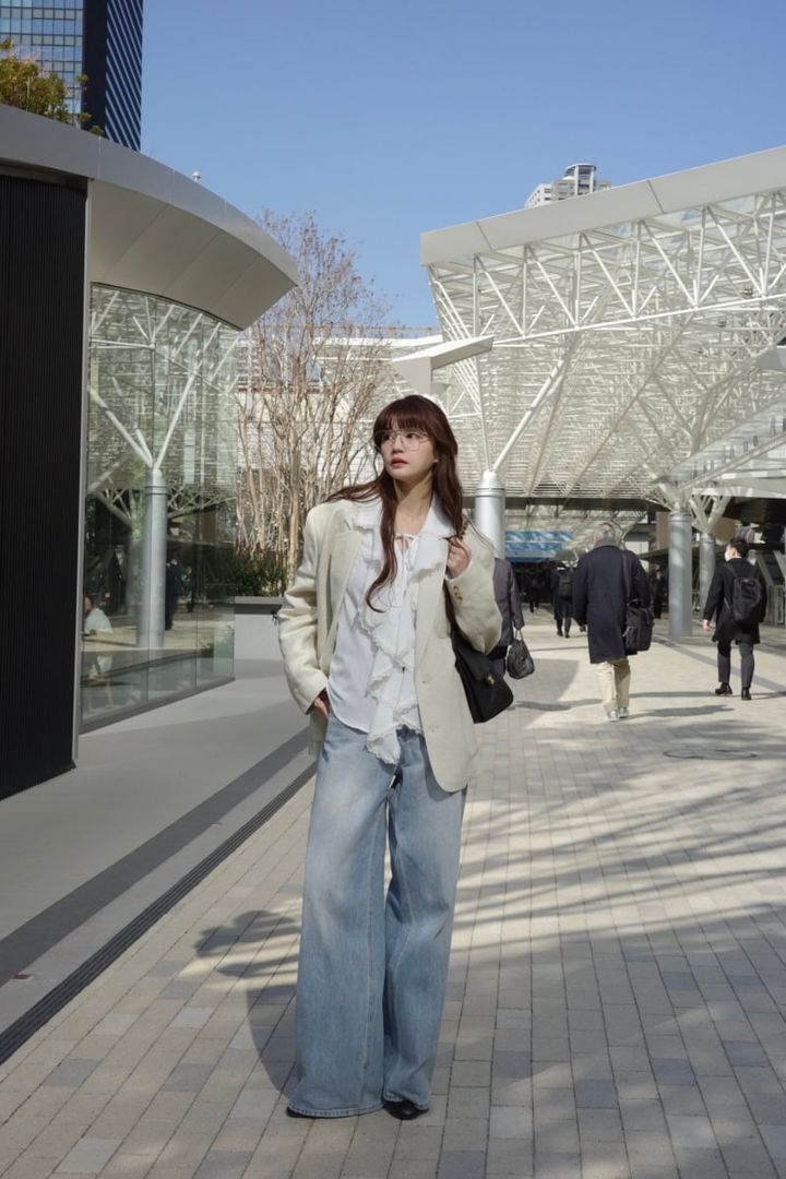 淡色のジャケットとデニムパンツをあわせた、女性らしさを感じるスタイリング。中には、ボリューミーなフリル使いのブラウスを入れて、華やかさを足しています。