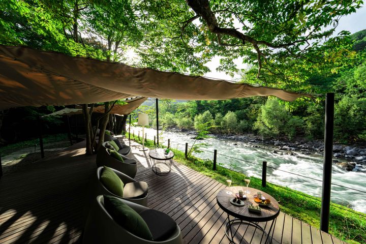 いろいろな過ごし方ができるのも、この宿の大きな特徴。川音に癒やされながら2つの露天風呂(ひとつは館内、もうひとつはホテルより車で5分の場所に位置し、6〜11月の期間限定での貸し切り利用)に浸かったり、テラスでゆったり朝食やシャンパンを堪能したり……と、館内だけで過ごすのもアリ。