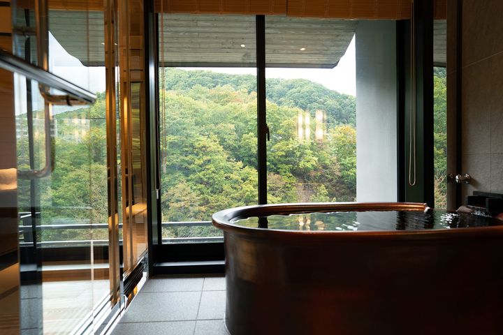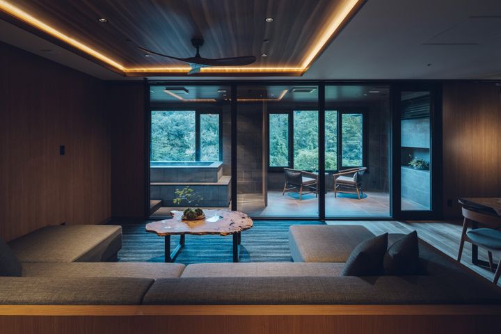 客室の面積は最小でも100平方メートル以上で、すべてにテラスと半露天風呂が備わっており、部屋にいながら森林浴気分が味わえるタイプもある。