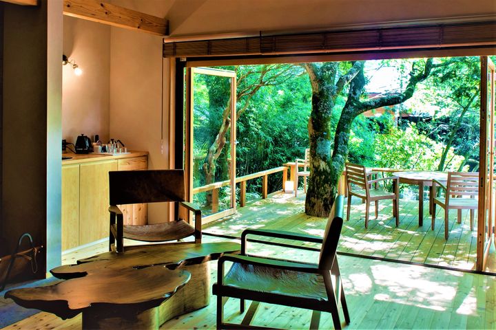 生い茂る木々に包まれ、隣接する建物もなく、リュクスな秘密基地のようなステイが叶うこの宿は、まさに大人のための場所といえる。