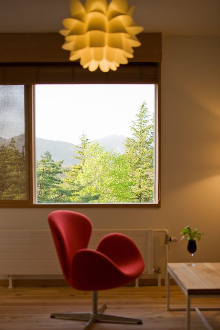 すべての部屋から森や山が見え、木の香りや木目の美しさにホッと心が休まるはず。