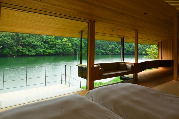 地形や気候、日照条件などの入念なリサーチのもと、恵那峡の自然と調和するように設計された無駄のないミニマルなルックスで、訪れるゲストの心を掴んでいる。