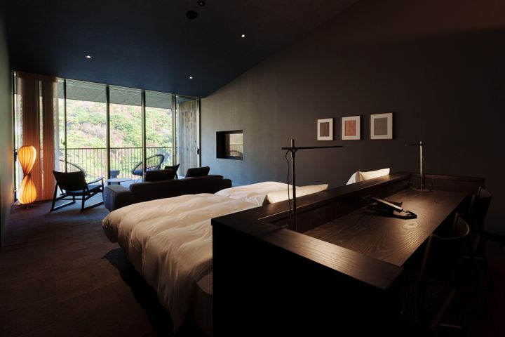 4タイプ26室ある客室はすべてスイート仕様で、モダンな和洋折衷スタイルと木のぬくもりが特徴。しかも、プライベート展望風呂温泉付きなのがありがたい(客室の風呂に加え、温泉大浴場と露天風呂もあり)。