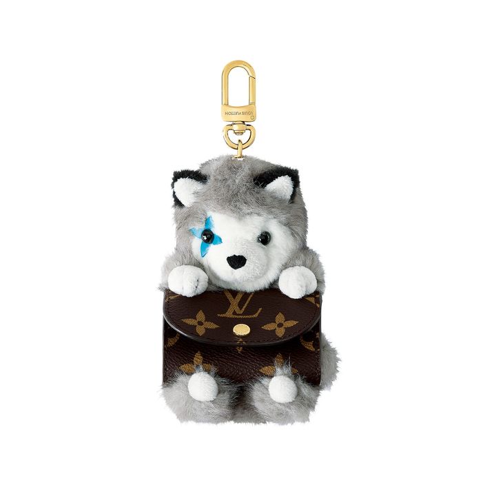 瞳にモノグラム・フラワーがあしらわれた、ハスキー犬のバッグチャーム。小物入れとして使えるモノグラム・レザーのポーチ付き。