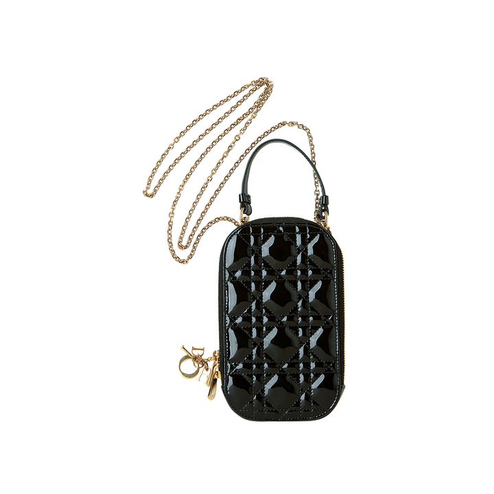パテントカーフスキンの上品な光沢がフォーマルなドレスアップにも映える“レディ ディオール”のフォンホルダー。トップハンドル、チェーンハンドル、チャーム全て取り外しが可能。