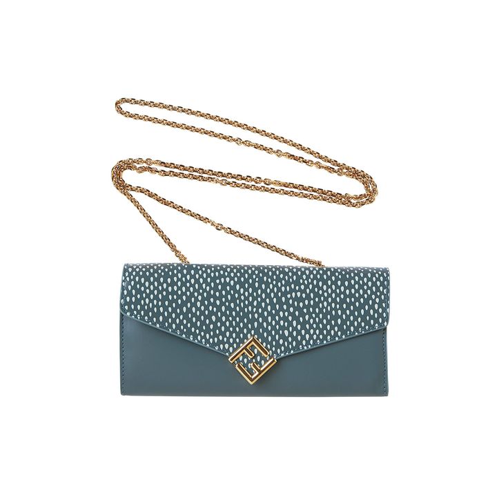落ち着いたブルートーンに幾何学柄のフラップと斜めの“FF”ロゴをあしらって。上品&アーティな印象を放ちます。
