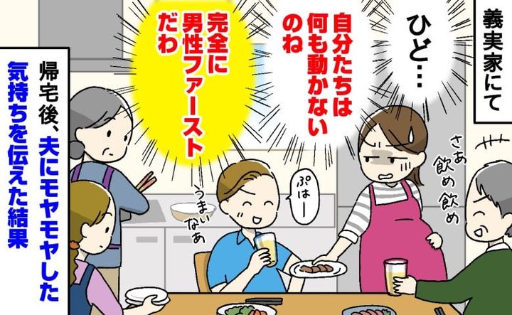 「なんで?」義実家では義父と同じく家事をしなくなる夫。私が妊娠中でも男性ファースト!?帰宅後、夫にモヤモヤを伝えた結果