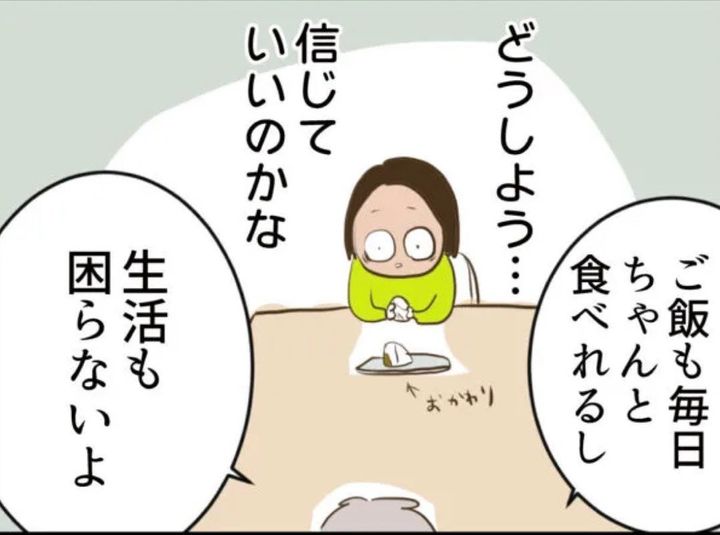 マルコさんが人から聞いた話にフィクションを加えて漫画化した「怖すぎる隣人」。押し入れに隠れた息子だったが、見知らぬおじさんに見つかってしまった。しかし彼はとてもやさしく、家に招いておにぎりを食べさせてくれた。いったい誰なんだろう?