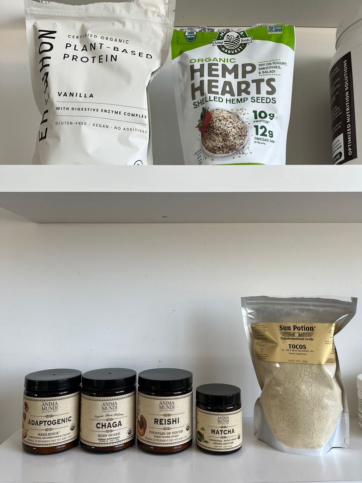 愛用しているプロテイン。左から添加物のないオーガニックプロテイン、ヘンププロテイン、ボーンブロス。 Hearst Owned