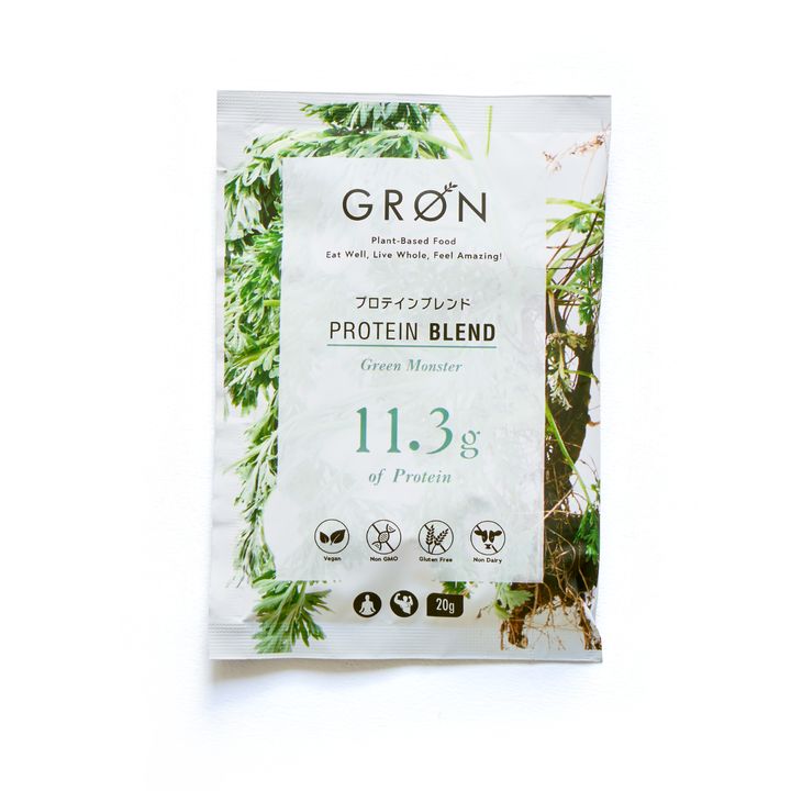 「よもぎや熊笹、スピルリナなどのスーパーフードと甘酒を合わせ、白砂糖や人工甘味料、乳化剤など添加物フリーの、原材料にこだわったプロテイン」。グロン プロテインブレンド グリーンモンスター 20g ¥346/グリーンベース