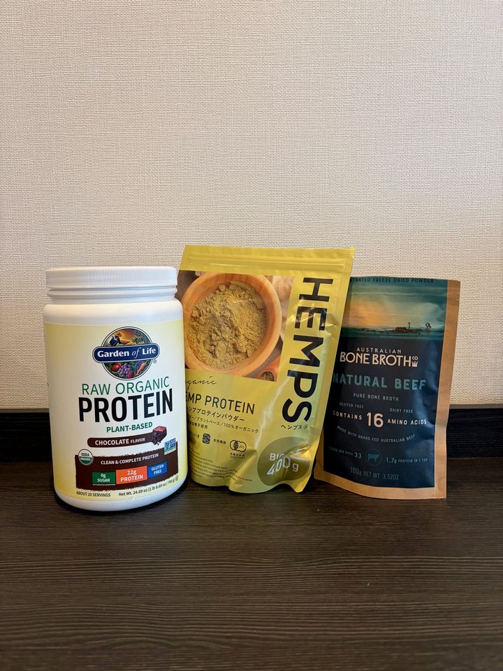 「普段は朝昼晩と3食お肉かお魚を食べ、食事でタンパク質をまかなうようにしています。プロテインを飲むとおなかが張ってしまうタイプなので、それでも足りないときはボーンブロスかピュアなアミノ酸パウダーで補充。そんな私でも植物性のヘンププロテインはおなかが張りにくいので、規定の半量ほどを朝のウォーキングの間、20~30分かけてゆっくり飲むようにしています。消化力やライフスタイルに合った方法を見つけるのが大切! 」