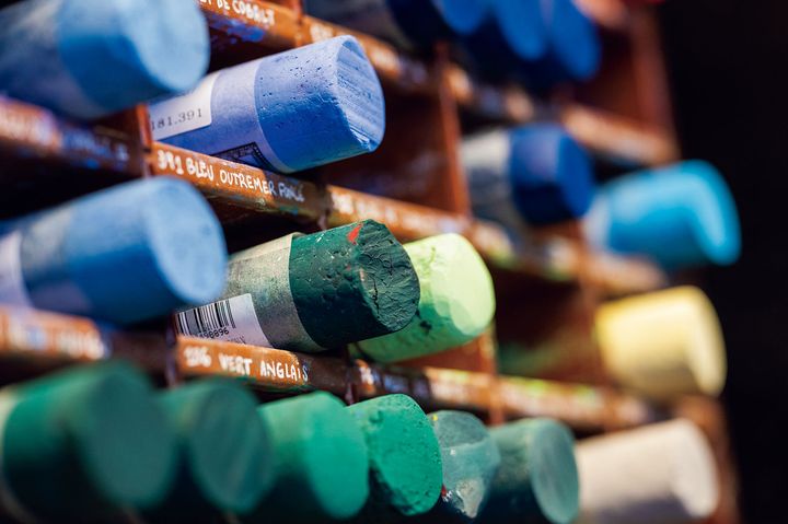 1904年から3年をかけ完成したソフトパステル“ア・レキュ”が棚に並ぶ。高純度の顔料はベルベットのような質感が魅力。