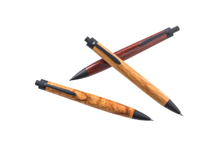 三重県伊勢市の工房で一本ずつ丁寧に製作されているペン。しっかりとした握り心地の木軸は、チンチャンやセンダンをはじめ、ケヤキやソメイヨシノのほか、ウイスキーを熟成させる際に使われていた樽など、様々な天然木を手作業で削り出し磨き上げたもの。手の油分と経年によって徐々に艶が深まっていくのも魅力だ。一つとして同じものはない木目や色合いが、唯一無二の表情を生み出している。