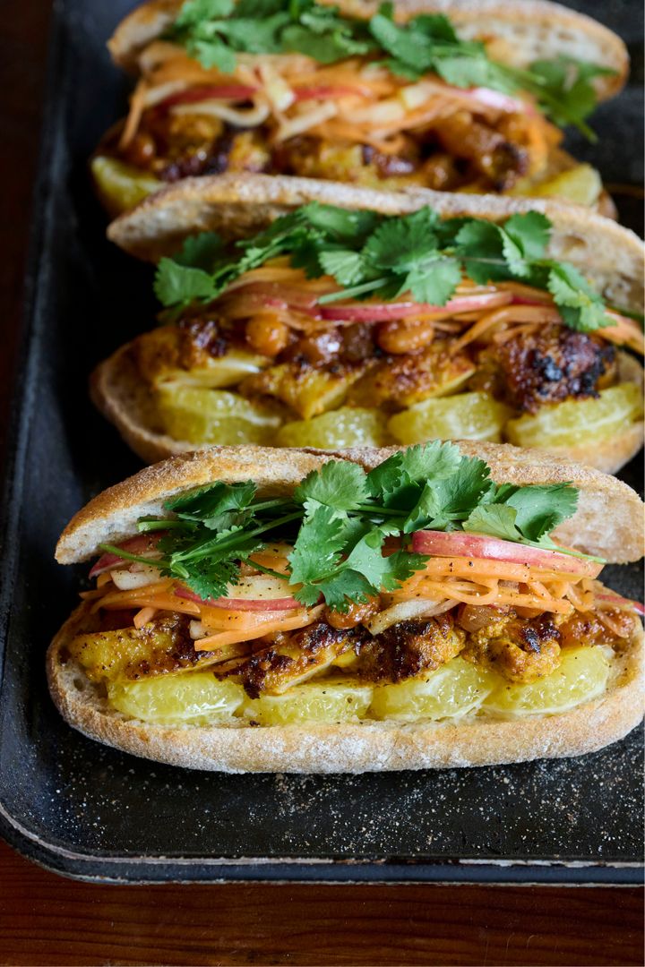 「コモパン」では常に3種類くらいのサンドイッチがある。なかでも人気なのが、小森さんのこだわりが凝縮した、彩り豊かな「スパイシーチキンのバインミー」(¥750)だ。最大の特徴は地元農家から届く「今まさに食べ頃を迎えた素材のおいしさ」をダイレクトに反映させていること。だからこそ、定番とはいえ、なますに使う野菜やフルーツは週替わり。その時々の出会いから素材と味を組み立てている。