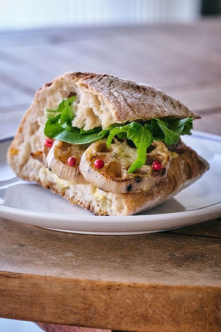 シンプルな野菜のサンドを食べ飽きない味へと引き立てるのが、にんにくを利かせた自家製フムス。「野菜から出る水分を吸ってちょうどいい口当たりになるよう、あえて固めに仕上げるのがポイント」と北村さん。パンを斜めに深くカットするのは、あふれんばかりの具材をしっかり受け止めるための工夫。6枚ものれんこんが重なるボリューム感はうれしい限り。