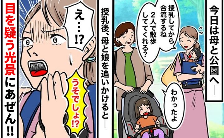 「うそ…!?」公園でベビーカーの娘を母に預けると…遠くの娘の姿に違和感が!私が慌てふためいたワケ