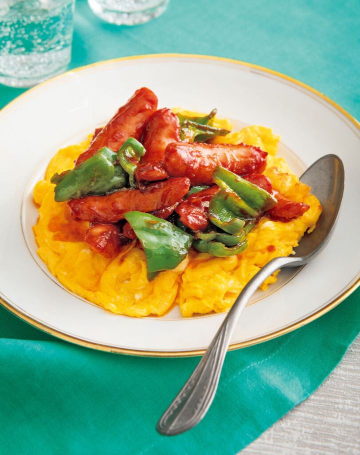 半熟に仕上げた卵に、ケチャップベースの具をのせれば、ご飯がすすむおかずに早変わり。ソーセージのうまみとピーマンのシャキッとした食感がアクセント。つい夢中で完食してしまうおいしさです。
