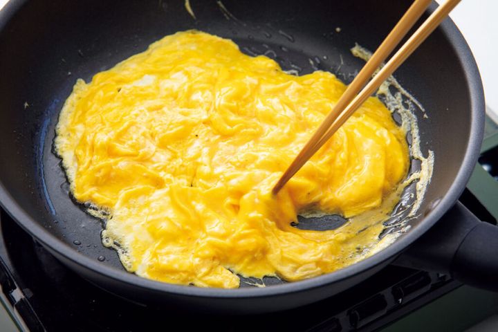 とろとろの食感に仕上がるよう、卵液をフライパンに入れたら大きく混ぜながら火を通し、早めに器に取り出しましょう。