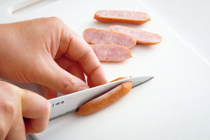 (1)ピーマンは縦半分に切ってへたと種を取り、一口大の乱切りにする。ソーセージは縦半分に切る。ボールに卵を割りほぐし、塩、こしょうを加えて混ぜる。〈A〉は混ぜる。