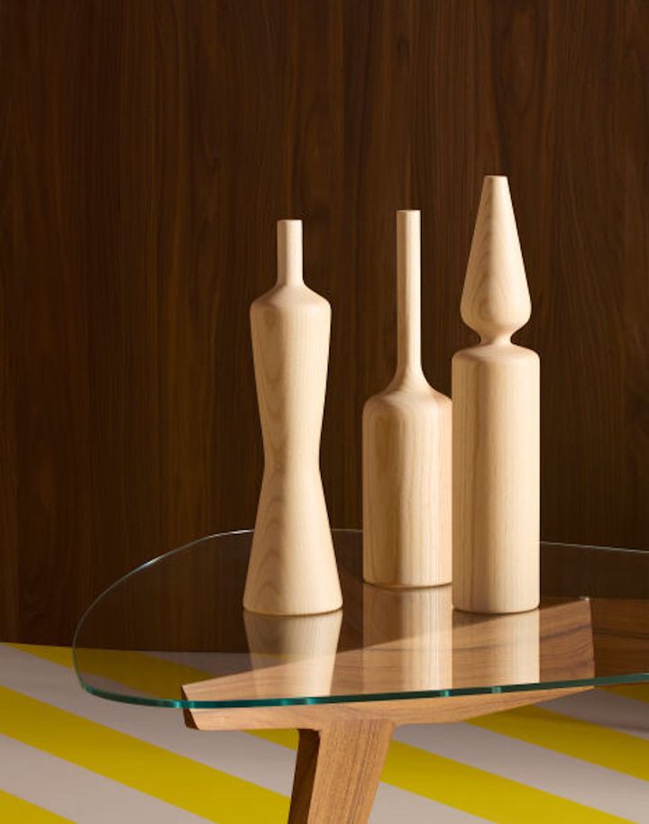 “ボッティリエ”は、小さな家族のような3本のボトルからなる木製のオブジェのセット。その特徴は、対照的な仕上げを施した2種類のアッシュ材とロビニア材の組み合わせにある。これによって素材のコントラストが際立ち、思いがけない視覚的調和が生まれた。